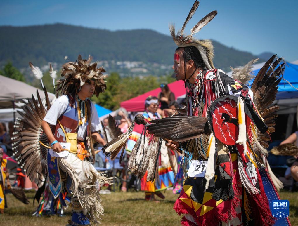 7月15日,在加拿大溫哥華,穿著傳統盛裝的印第安原住民參加“帕瓦”活動。