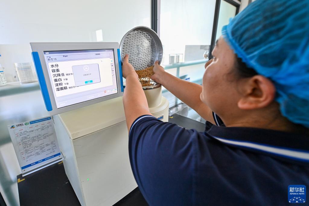 新疆呼圖壁縣一家糧食收購企業的工作人員對交售的小麥進行檢測(7月15日攝)。