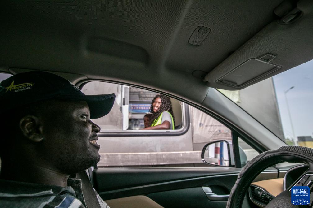 5月13日,蘇信開車經過塞內加爾捷斯-圖巴高速公路捷斯收費站時,與妻子莫妮克短暫交流。新華社記者 李亞輝 攝