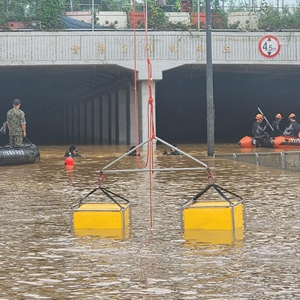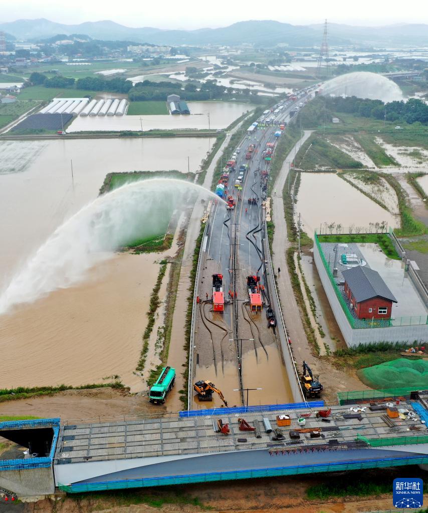 7月16日,在韓國忠清北道清州市,救援人員進行抽水和搜救作業(無人機照片)。