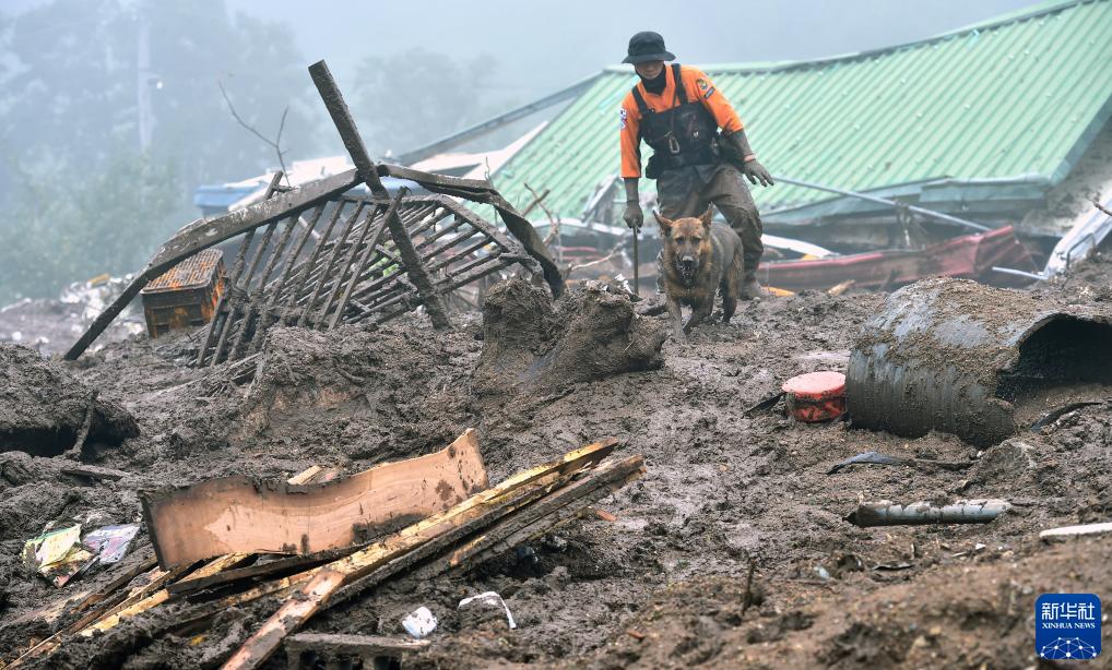 7月16日,在韓國慶尚北道醴泉郡,救援人員在因暴雨引發山體滑坡的村莊內搜救。
