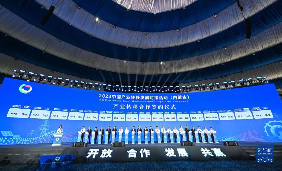 當日,以“開放、合作、發展、共贏”為主題的2023中國產業轉移發展對接活動(內蒙古)開幕式暨簽約儀式在內蒙古呼和浩特舉行。