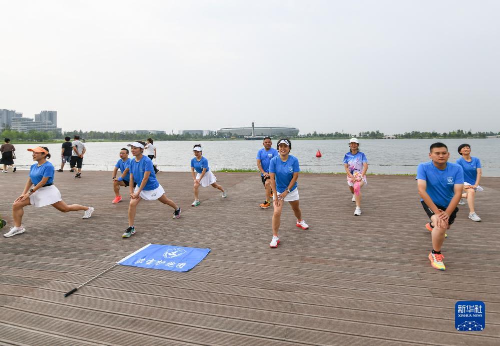 在成都市龍泉驛區東安湖體育公園,杜以萍(前右二)和跑團成員熱身(7月12日攝)。