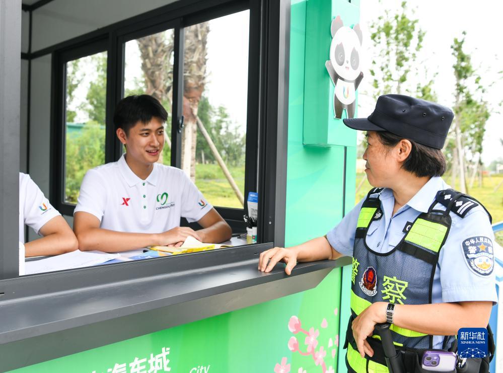 在成都市龍泉驛區東安湖體育公園,杜以萍(右)外出巡查時路過成都大運會城市志愿服務小站,與正在擔任志愿者的兒子周柯名交流(7月12日攝)。