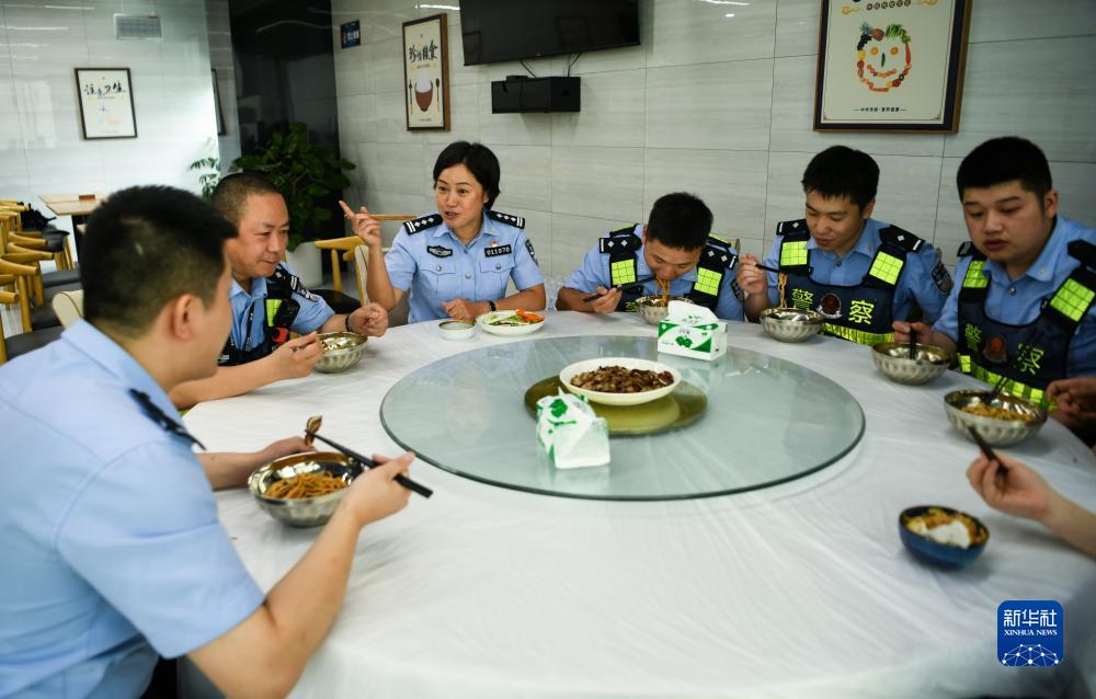 在成都市龍泉驛區東安派出所,杜以萍(左三)和同事吃午飯(7月12日攝)。