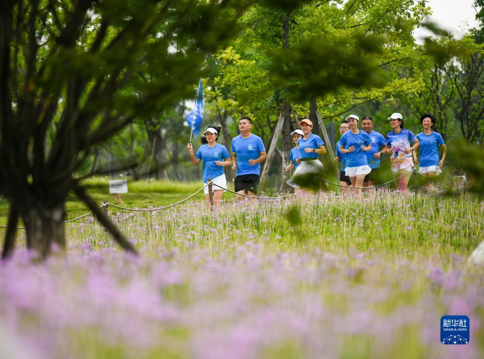 在成都市龍泉驛區東安湖體育公園,杜以萍(左一)帶領跑團成員跑步(7月12日攝)。