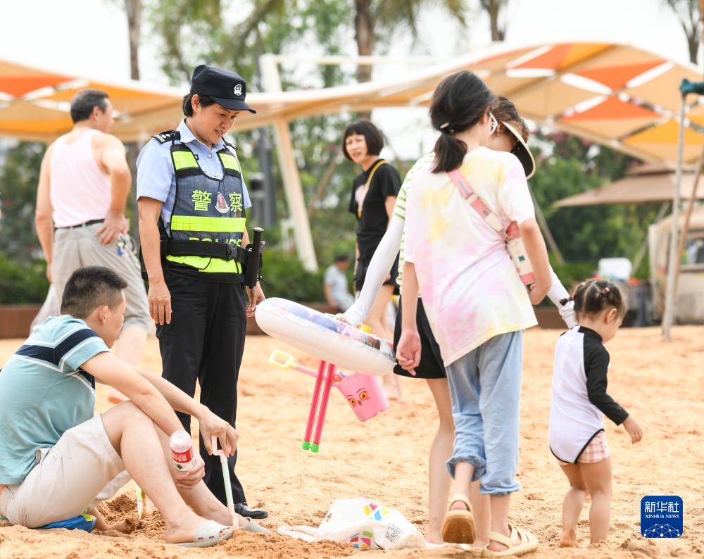 在成都市龍泉驛區東安湖體育公園銀沙灘,杜以萍(左二)提醒帶著孩子游玩的家長注意安全(7月12日攝)。