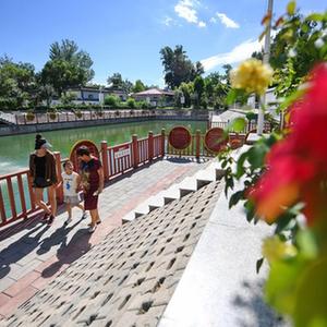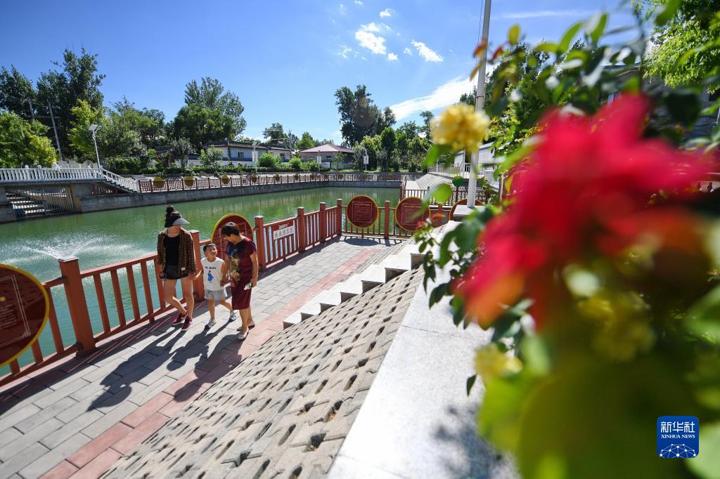 7月16日,村民在河北省涿州市東仙坡鎮西仙坡村由垃圾坑塘經過治理建成的游園內行走。