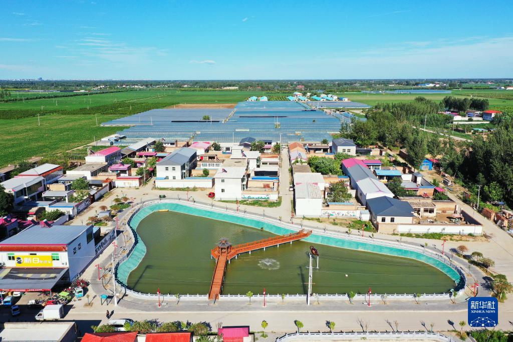 河北省涿州市高官莊鎮上莊村由垃圾坑塘經過治理建成的游園(7月16日攝,無人機照片)。