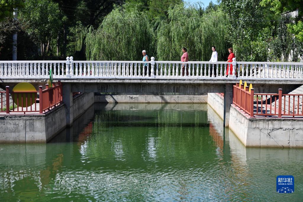 7月16日,村民在河北省涿州市東仙坡鎮西仙坡村由垃圾坑塘經過治理建成的游園內行走。