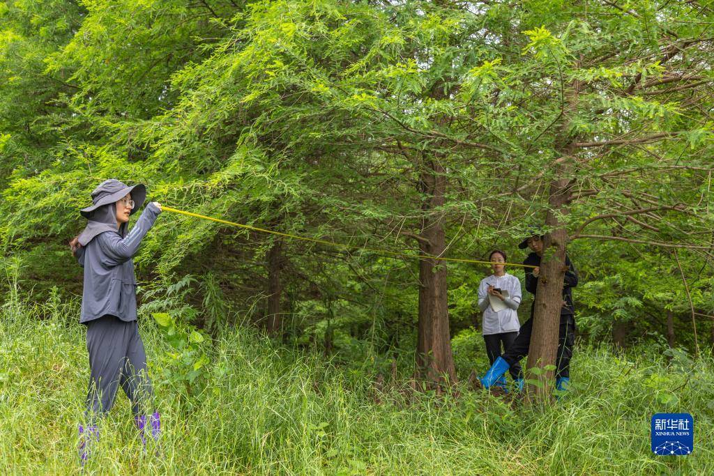 在重慶市忠縣,中國科學院成都山地所科研人員在測量三峽水庫消落帶池杉的生長情況(7月6日攝)。