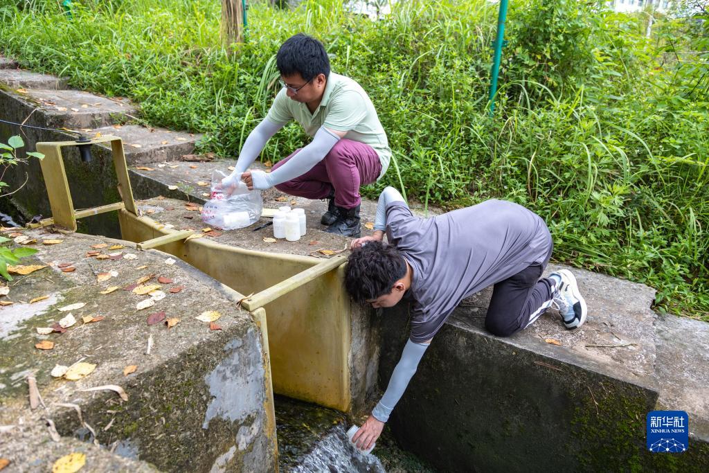 在中國科學院三峽庫區水土保持與環境研究站實驗樣地,中國科學院成都山地所科研人員在小流域出口收集水樣(7月6日攝)。