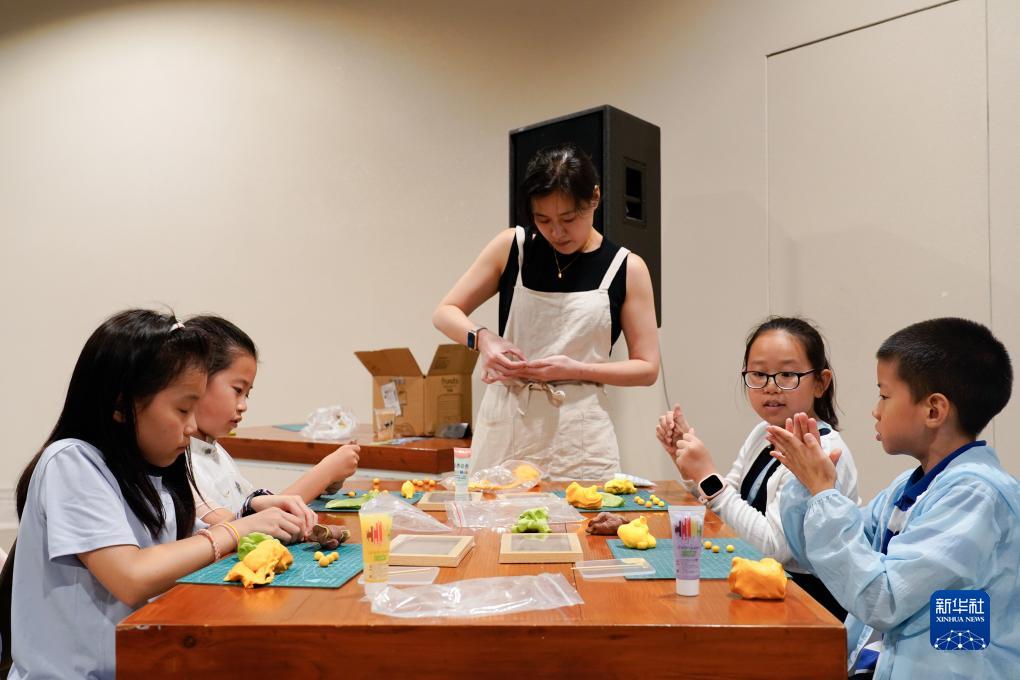 7月16日晚,小朋友在世博會博物館制作向日葵粘土相框。