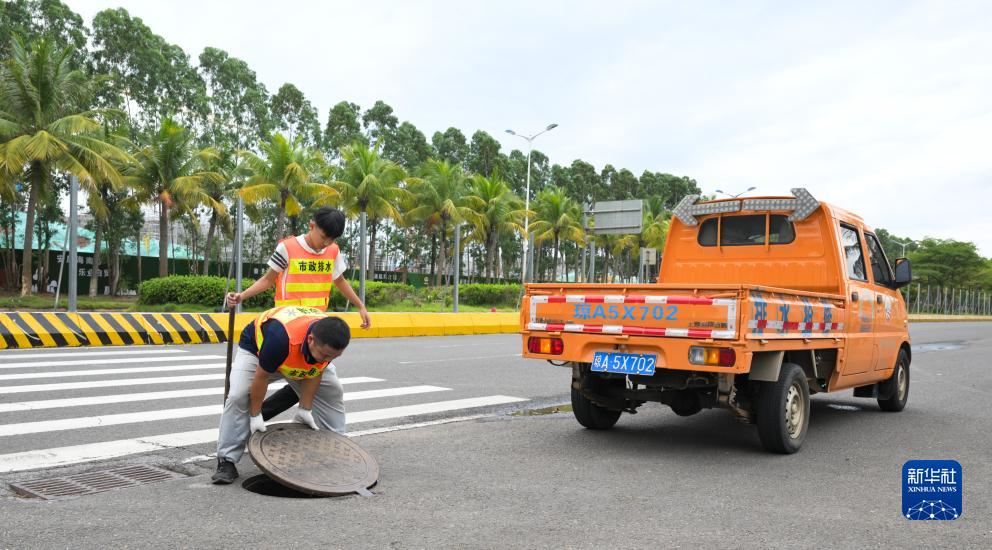 7月17日,在??谑袨I海大道,工作人員在檢查排水設施。
