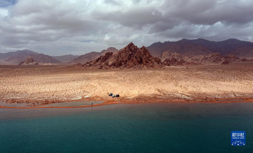 6月30日,在新疆阿爾金山國家自然保護區拍攝的阿雅克庫木湖旁的祁曼塔格山(無人機全景照片)。