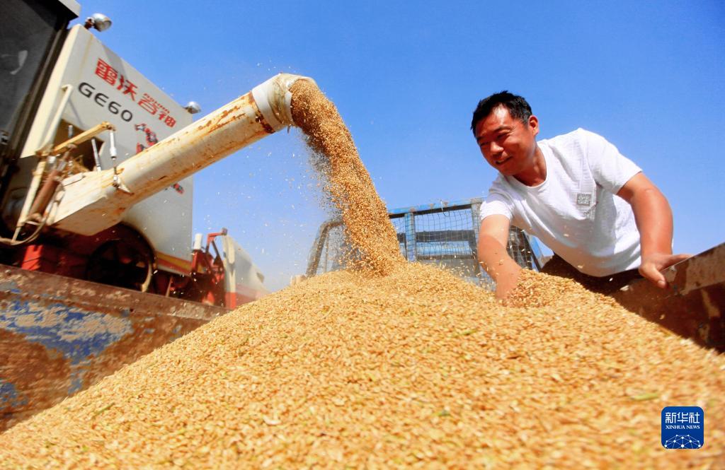 山東省臨沂市平邑縣地方鎮農民將收獲的小麥裝車(6月13日攝)。