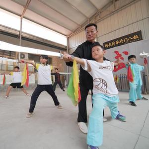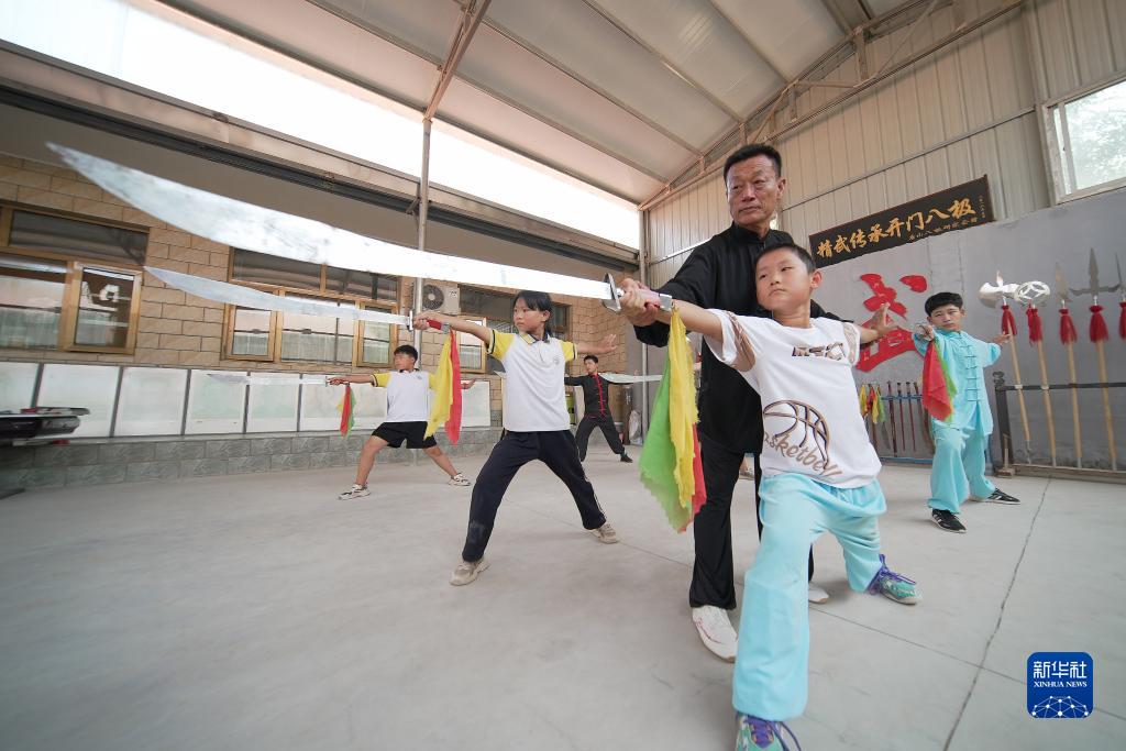 7月17日,在河北省滄州市孟村回族自治縣新縣鎮羅疃村,志愿者教孩子們練習傳統武術。