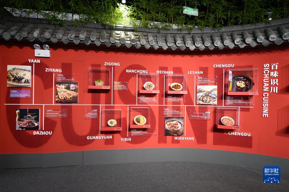 這是7月16日拍攝的大運村藝術中心內一處介紹四川美食的展示墻。
