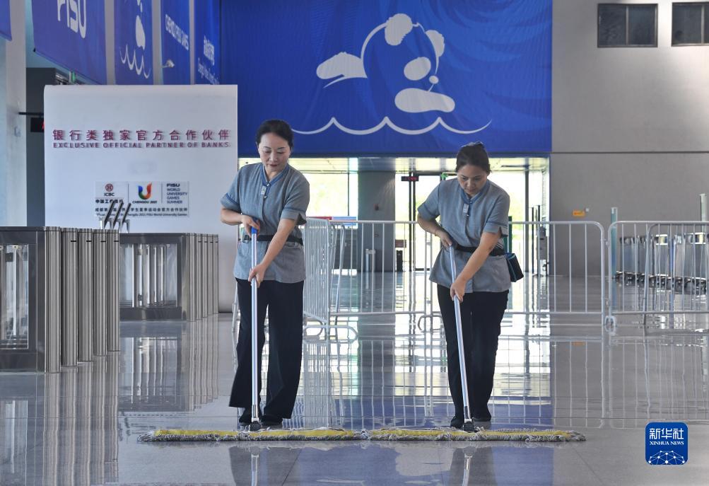 7月16日,華潤置地物業保潔人員在游泳跳水館打掃地面衛生。
