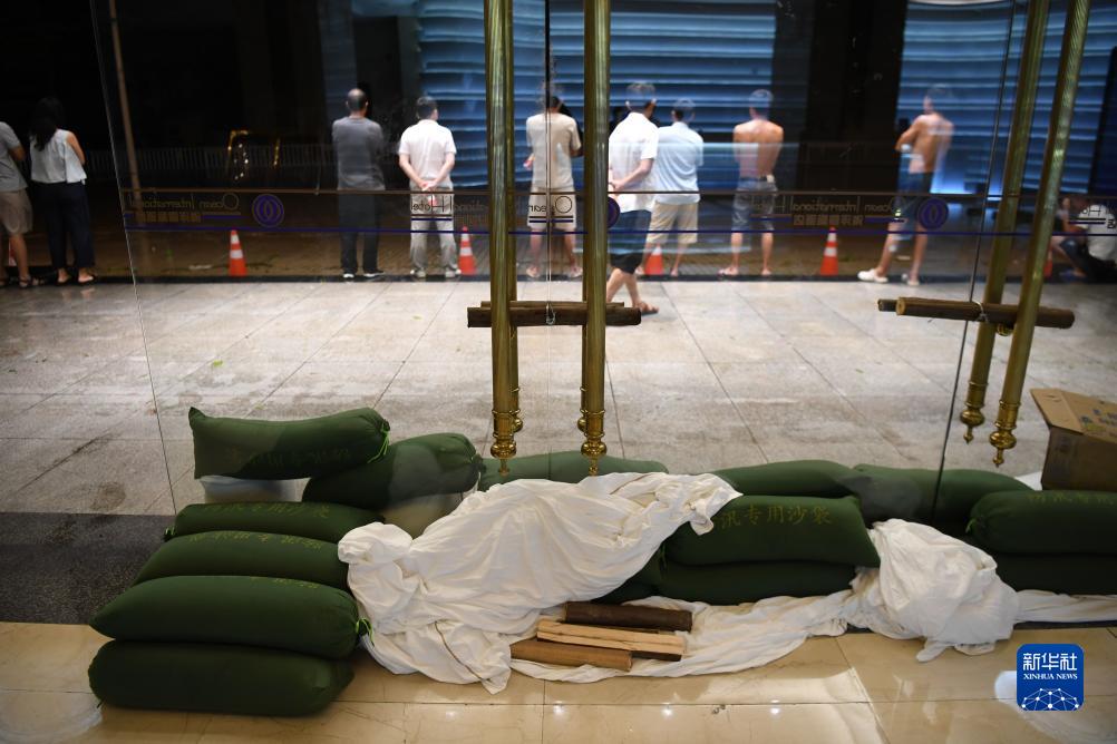 7月17日晚,在廣東湛江海濱大道北一處酒店,門口堆放著防汛沙袋。