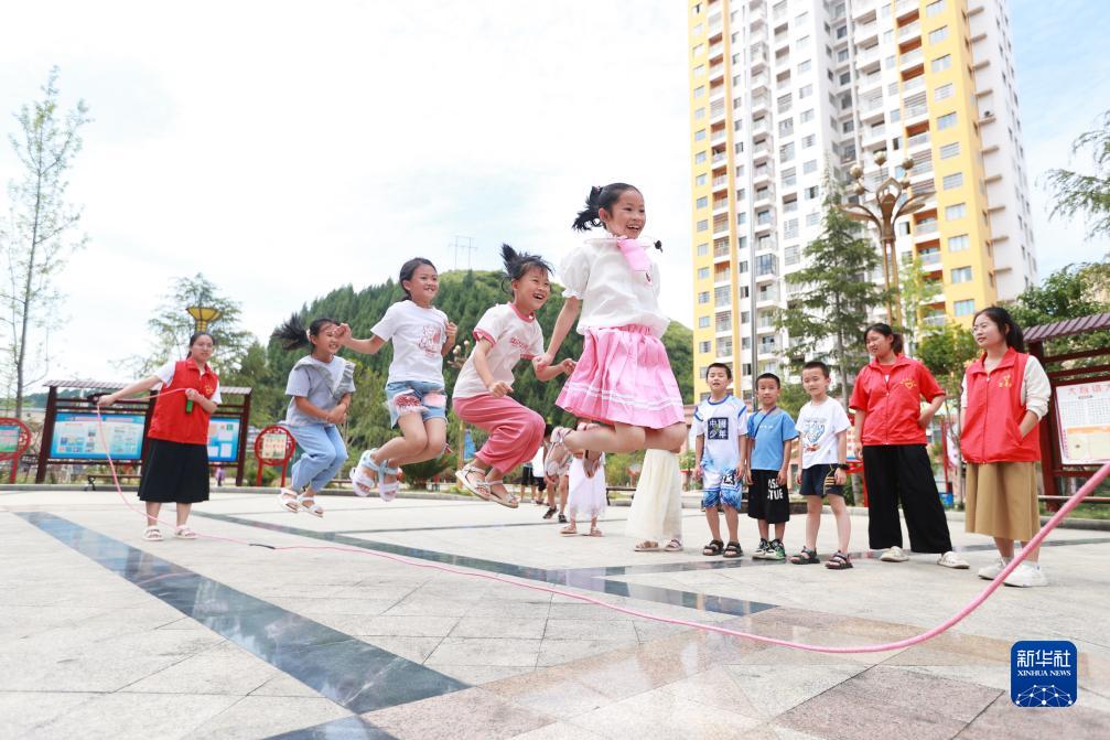 7月17日,在貴州省黔東南苗族侗族自治州岑鞏縣大有鎮大坪同心社區,大學生志愿者與孩子們一起跳繩。