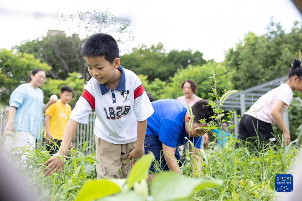 7月17日,在浙江省湖州市南太湖新區新風實驗小學教育集團清河校區勞動興趣課上,暑期托管班的學生在校農場里采摘甜瓜。