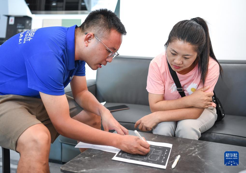 7月16日,月寨村足球隊球員李遠攀(左)在裝修設計公司給客戶講解設計方案。