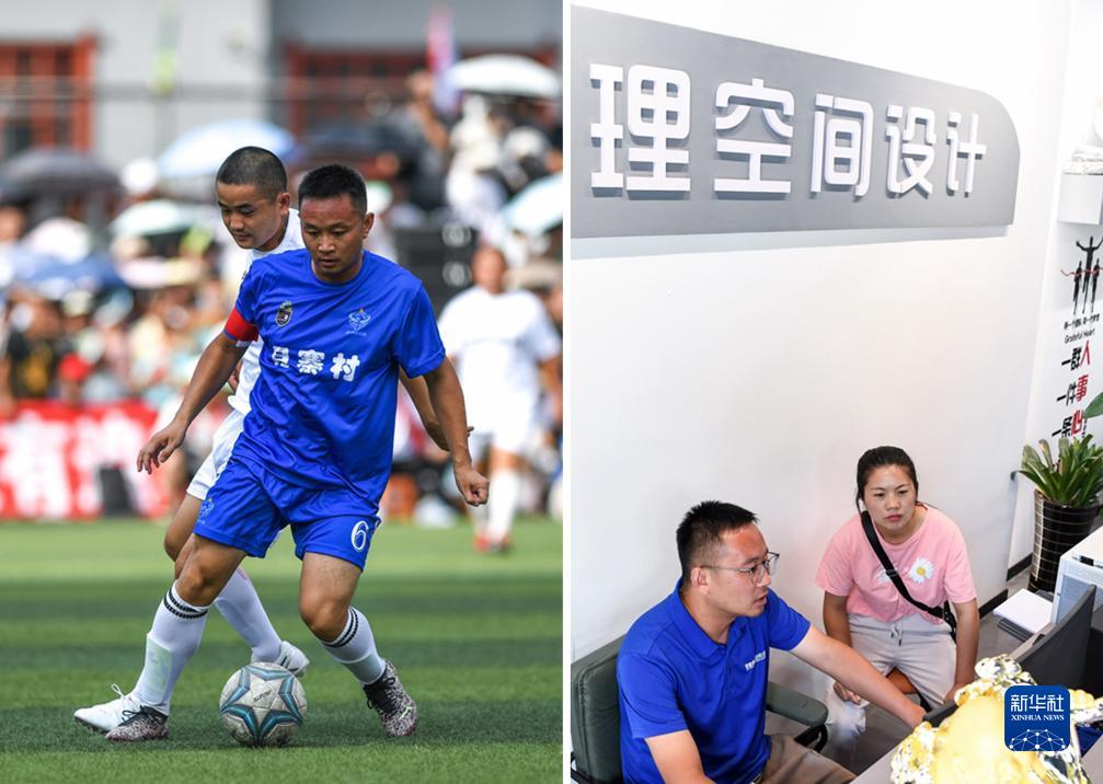 拼版照片:左圖為7月15日,月寨村足球隊球員李遠攀在賽場上拼搶;右圖為7月16日,李遠攀(左)在裝修設計公司給客戶講解電腦設計圖。李遠攀是一名室內裝修設計師,也是月寨村足球隊隊長。