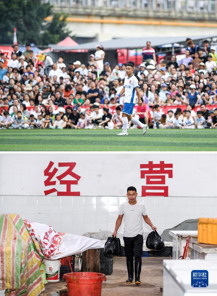 拼版照片:上圖為7月15日,豐樂村一隊球員賈勇輝在賽場上觀察;下圖為7月15日,賈勇輝在農貿市場給客戶送豆芽。賈勇輝是一名賣菜小販,平時靠制作和批發豆芽貼補家用,他在球隊里任后腰。
