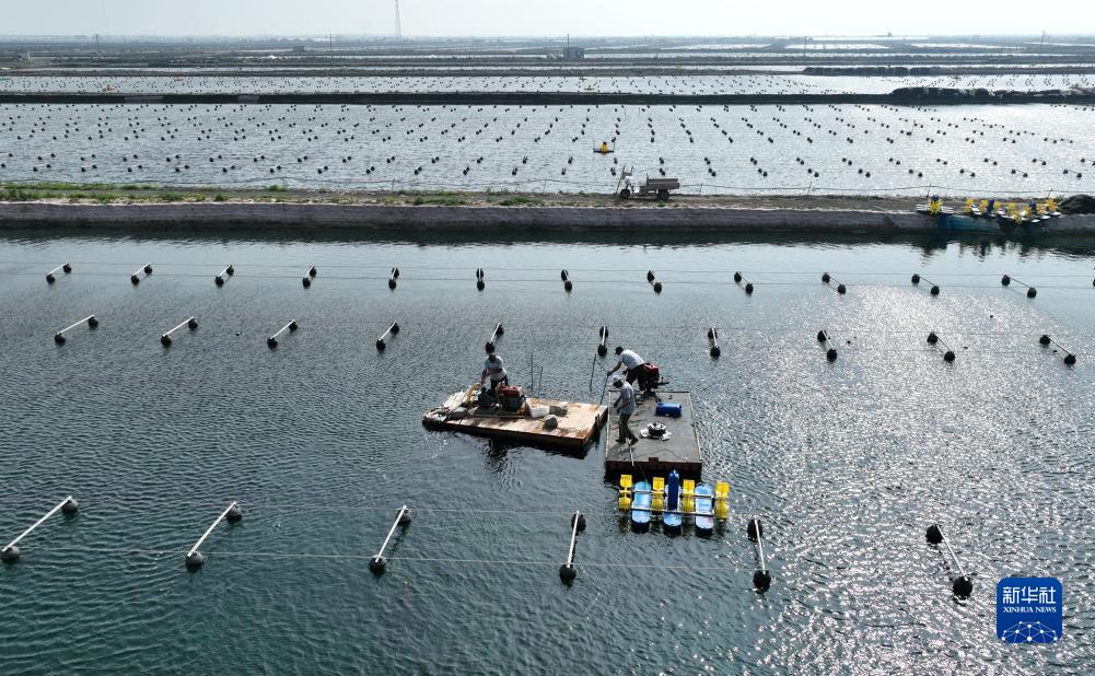 7月17日,河北省樂亭縣姜各莊鎮第二節村村民在海產品養殖基地的海參養殖池安裝增氧設備(無人機照片)。