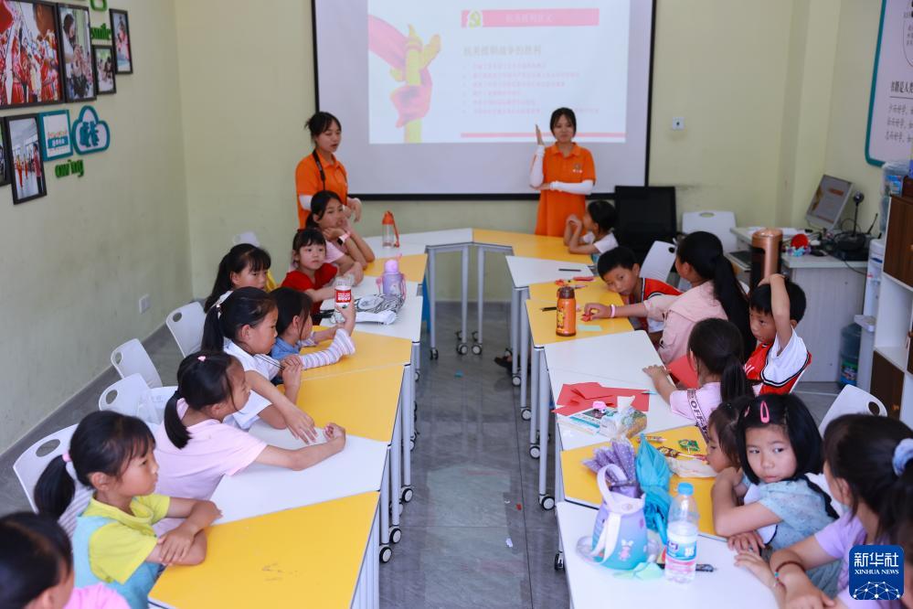 柏楊林街道,前來三下鄉的大學生向孩子們授課(7月13日攝)。