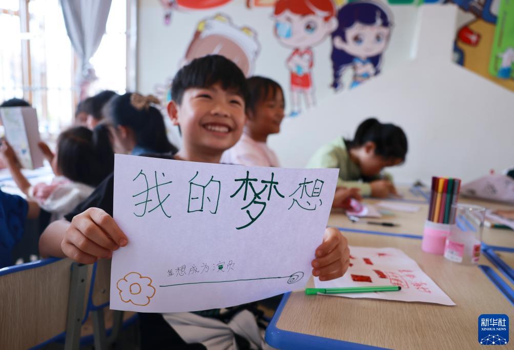 柏楊林街道,一名孩子寫下夢想(7月13日攝)。