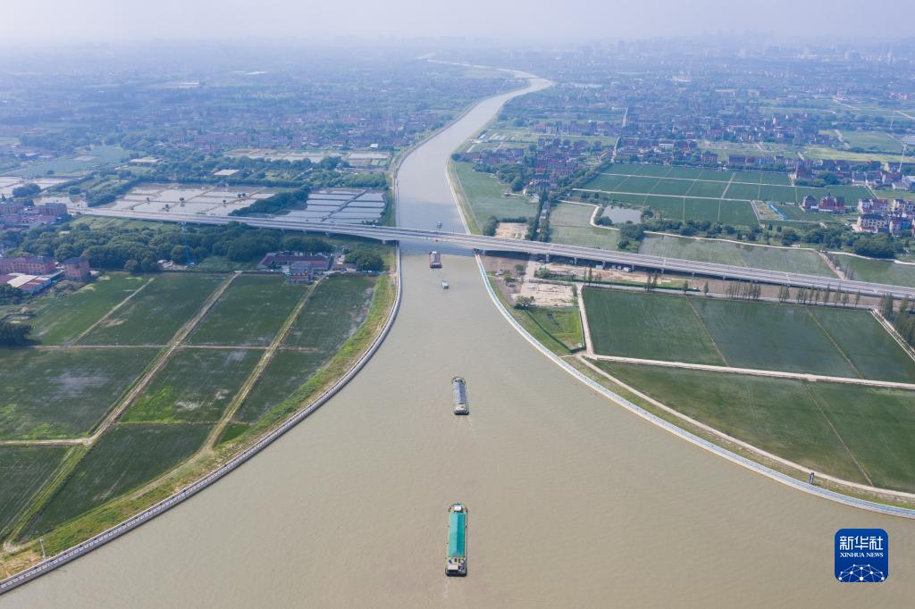 7月18日,首批通航貨船進入京杭運河杭州段二通道駛往錢塘江(無人機照片)。