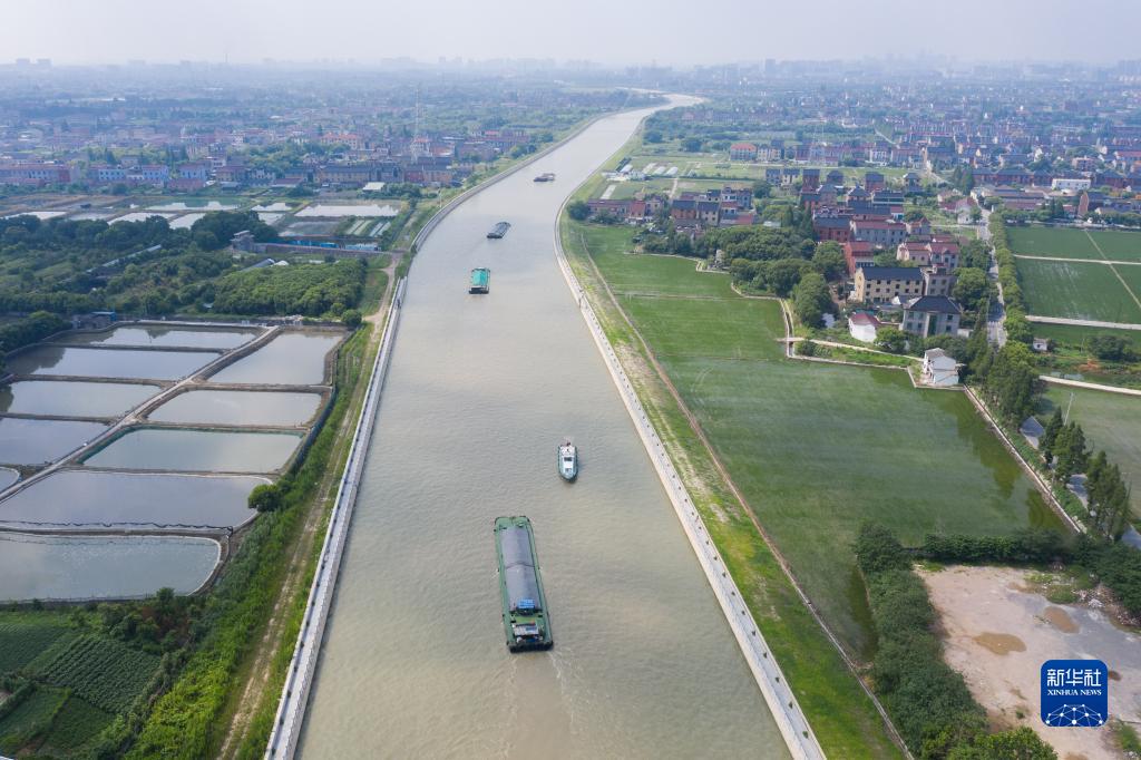7月18日,首批通航貨船進入京杭運河杭州段二通道駛往錢塘江(無人機照片)。