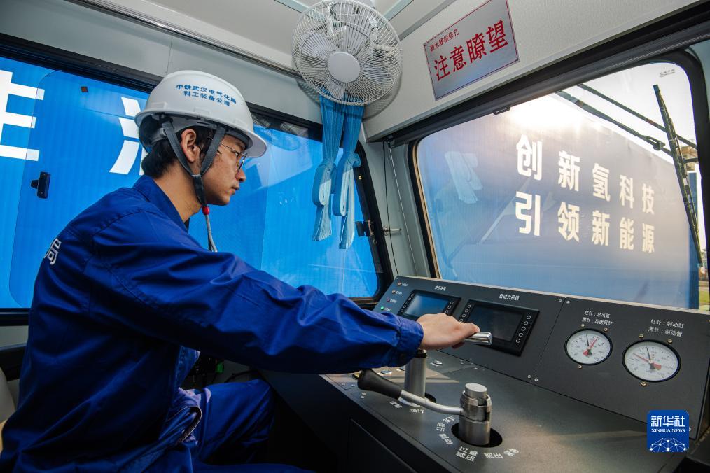 7月18日,駕駛員在氫能源地鐵施工作業車上試駕。