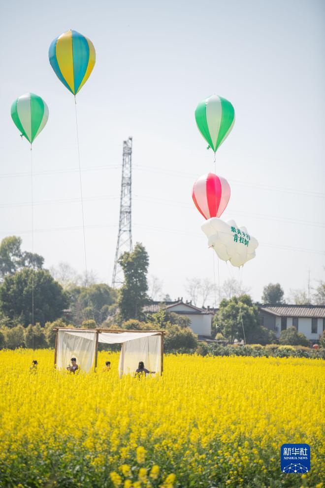 在成都市郫都區青杠樹村,人們在油菜花田里游玩(3月13日攝)。