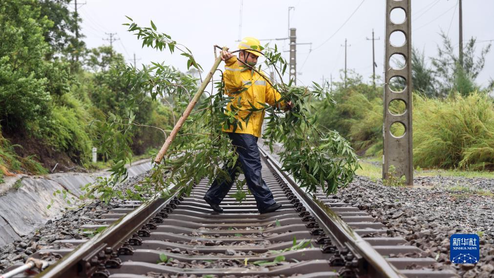 7月18日,國鐵南寧局沿海鐵路公司職工在清理軌道上的樹枝。當日,國鐵南寧局沿海鐵路公司組織職工利用軌道車,在風雨中對西部陸海新通道鐵路沿線進行巡檢,對線路和防洪重點處所進行全面巡查,及時處理危竹危樹、接觸網設備隱患等問題,全力確保鐵路運行安全。