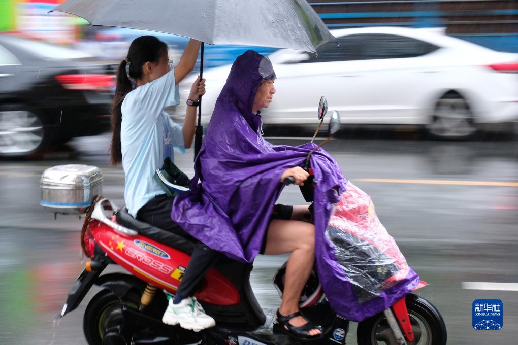7月18日,市民在南寧市市區冒雨騎行。