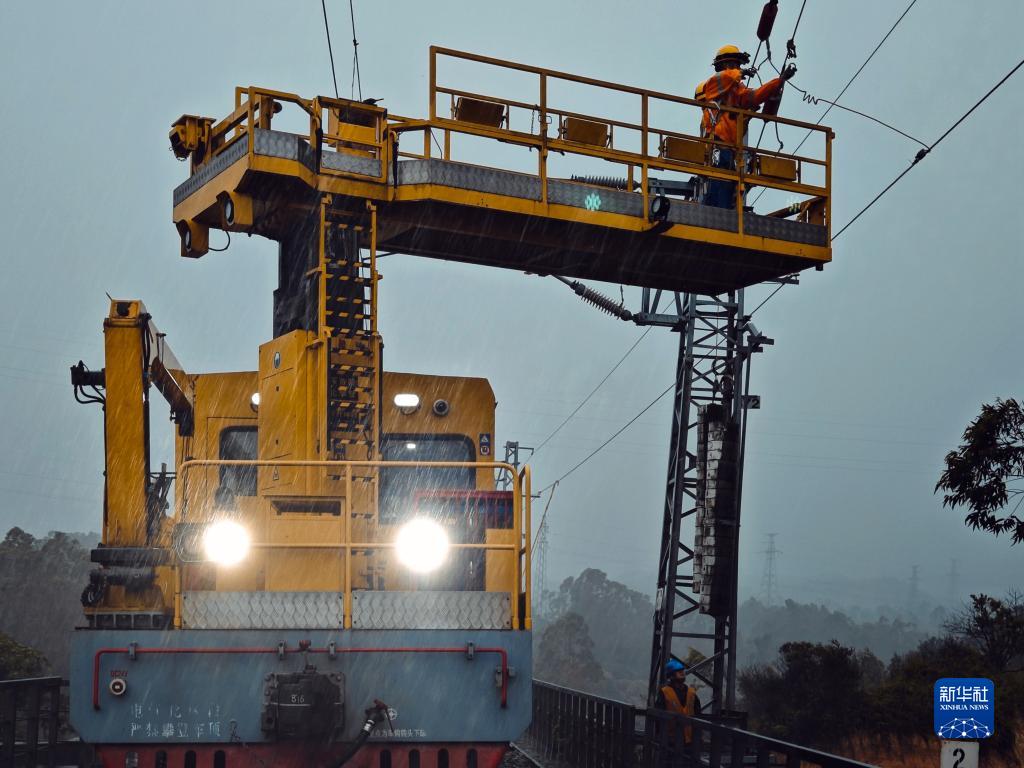 7月18日,國鐵南寧局沿海鐵路公司職工在排查接觸網。當日,國鐵南寧局沿海鐵路公司組織職工利用軌道車,在風雨中對西部陸海新通道鐵路沿線進行巡檢,對線路和防洪重點處所進行全面巡查,及時處理危竹危樹、接觸網設備隱患等問題,全力確保鐵路運行安全。