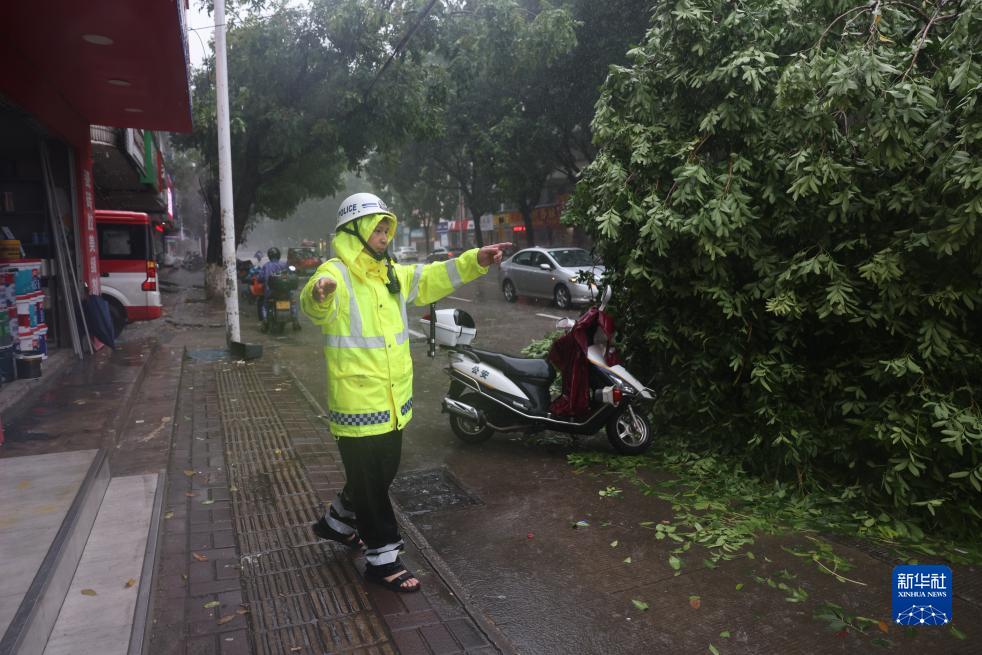 7月18日,在廣西欽州市文峰路,一名交警在被“泰利”臺風吹倒的樹邊指揮交通。