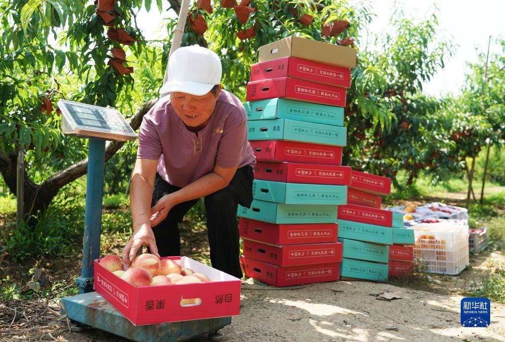 7月18日,在北京市平谷區大華山鎮的一處桃園,桃農將采摘好的桃子稱重。