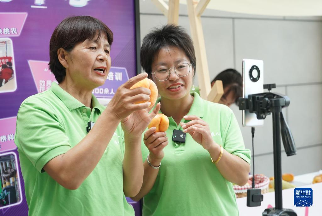 7月18日,在2023北京·平谷鮮桃季“土特產”市集現場,工作人員通過直播的方式進行桃子銷售。