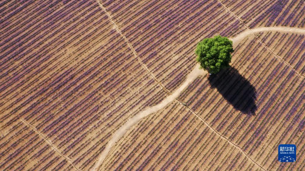 寧夏薰衣草莊園盛開的馬鞭草(無人機照片,7月15日攝)。