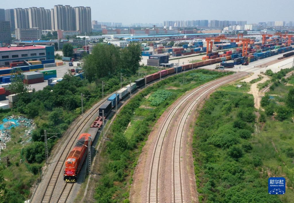 7月18日,X8003次中歐班列(中豫號)駛出國鐵集團鄭州局圃田車站(無人機照片)。