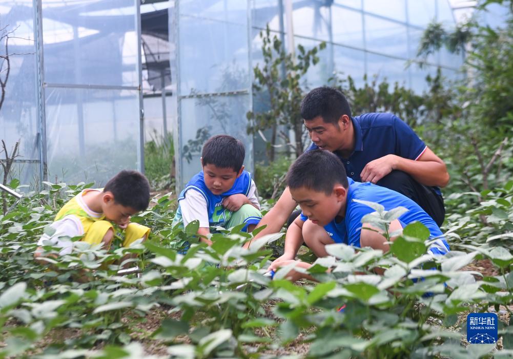 7月18日,在杭州富沈農業科技開發有限公司的研學基地內,參加暑期夏令營的孩子們在蔬菜地里除草。由銀湖街道新鄉賢打造的杭州富沈農業科技開發有限公司是集產、學、研于一體的農業綜合基地,通過“農業+教育+旅游+N”的融合模式,形成了觀光農業、農副產品加工、城市廚房、親子體驗等特色文旅項目。