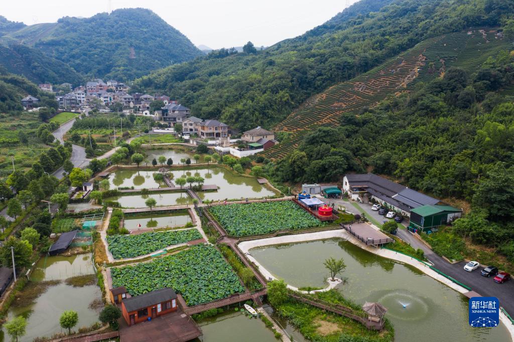 7月18日拍攝的杭州富陽廣吉生態農業基地(無人機照片)。位于杭州市富陽區銀湖街道坑西村的廣吉生態農業基地是由回歸的新鄉賢創辦,是一家集水產養殖、垂釣、餐飲、觀光于一體的農文旅休閑產業基地。