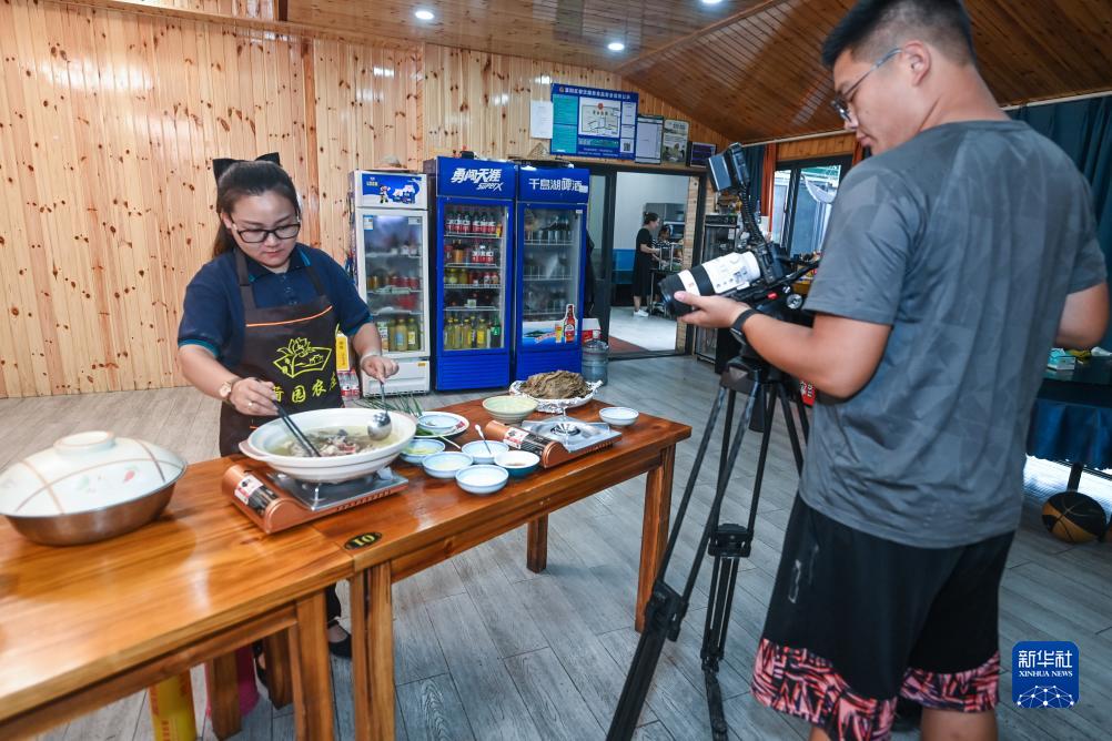 7月18日,在杭州富陽廣吉生態農業基地內,新鄉賢周小芳(左)正在進行電視專題片拍攝,推介當地特色美食。位于杭州市富陽區銀湖街道坑西村的廣吉生態農業基地是由回歸的新鄉賢創辦,是一家集水產養殖、垂釣、餐飲、觀光于一體的農文旅休閑產業基地。