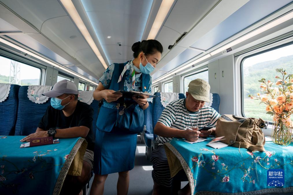 依波逢(中)在D887次列車上協助出境旅客填寫出境信息表(7月16日攝)。