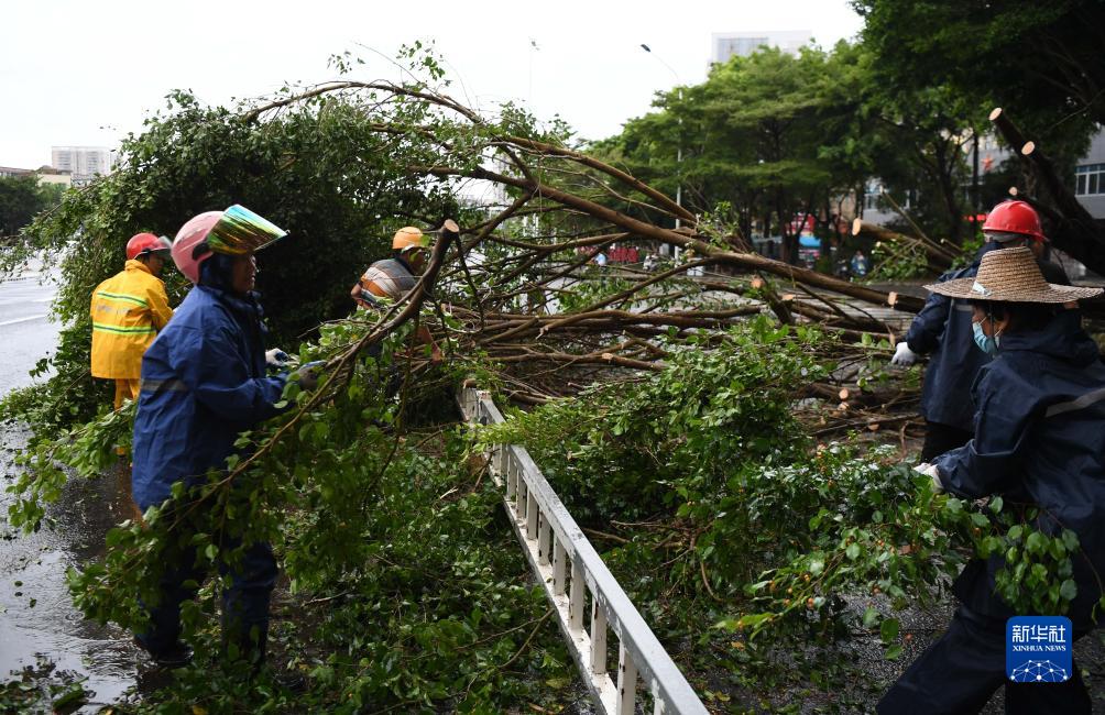 7月18日,在廣東湛江市軍民路,市政人員在清理倒伏樹木。