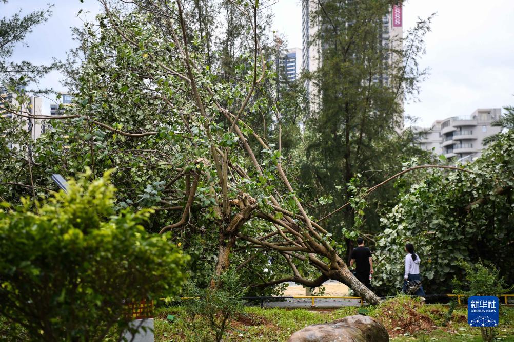 7月18日,在廣東湛江市廣州灣大道,市民從倒伏的樹木間走過。